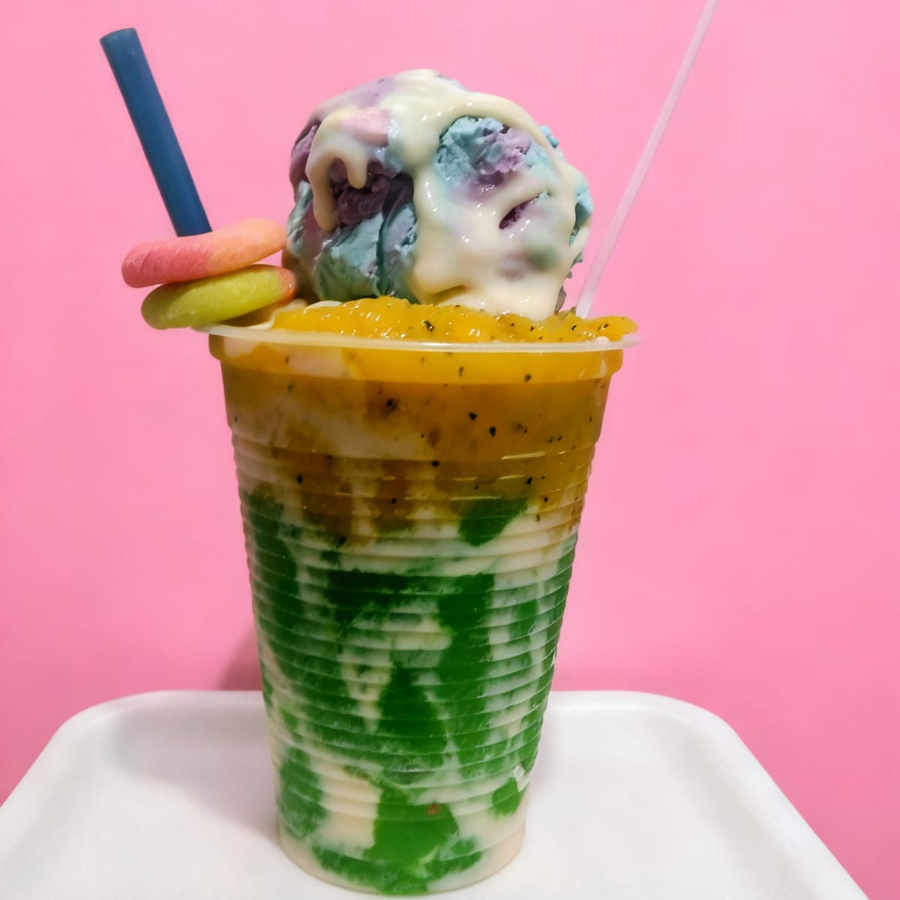DISFRUTA DE UN GRANIZADO DE FRUTA DE TU PREFERENCIA ACOMPAÑADO DE UNA BOLA DE HELADO DE TU PREFERENCIA - LECHE CONDENSADA - GOMITAS