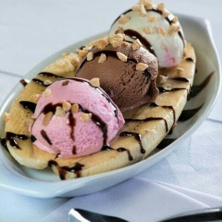 Para 1 : banana acompañada con 3 bolas de helado - salsas chocolate - leche condesada - crema especial de la casa - queso rayado - aderezo como ( coco - grageas - mani - milo )