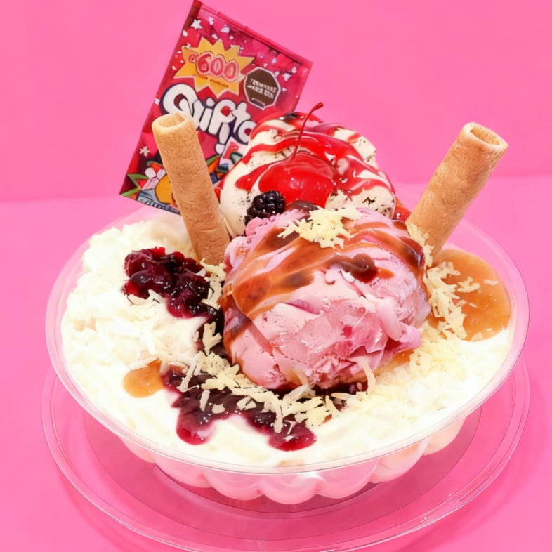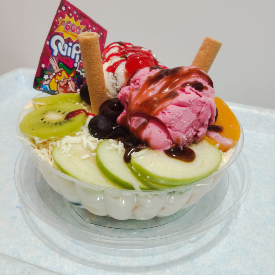 DISFRUTA DE UNA DELICIOSA ENSALADA 24 ONZ DE MIX DE FRUTAS 100% NATURAL - CREMA DE LA CASA - CAPA DE QUESO RAYADO - SALSAS - ADEREZOS - BARQUILLOS - ACOMPAÑADO POR DOS BOLAS DE HELADO Y UN TOPPING QUE PODRAS ELEJIR A TU GUSTO .