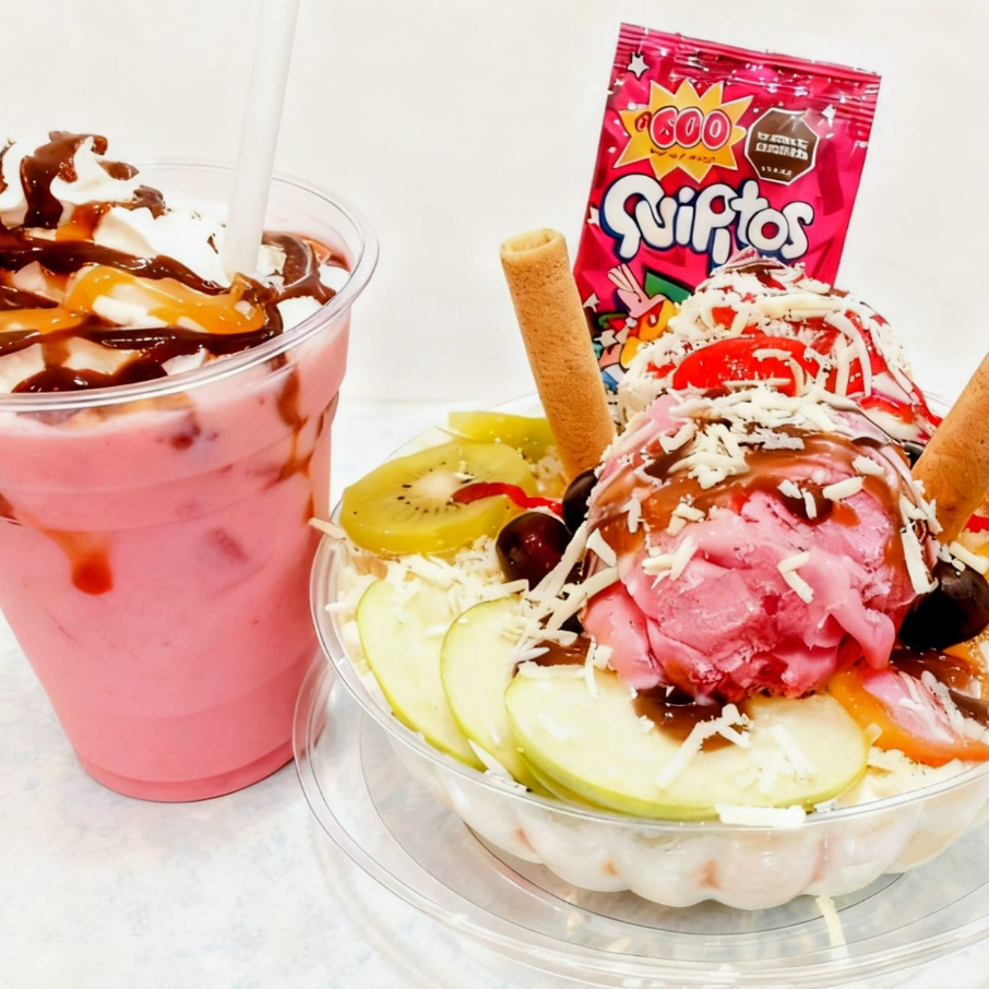 DISFRUTA DE UNA ENSALADA SUPER MALU MIX DE FRUTAS CON 2 BOLAS DE HELADO + UNA MALTEADA DE EL SABOR DE HELADO QUE ELIJAS + UN TOPPING COMBINACION PERFECTA PARA TU ANTOJO