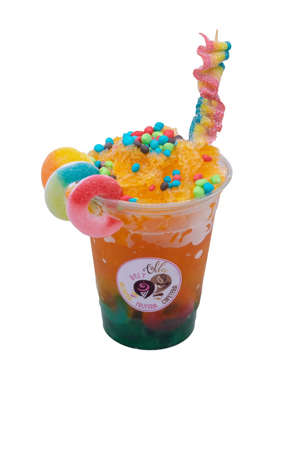 Aprox. 16 onzas :3 frutas 2 topings 1 bola de helado 1 salsa de tu preferencia entre (leche condensada o chocolate Herheys ) Chispitas o maní