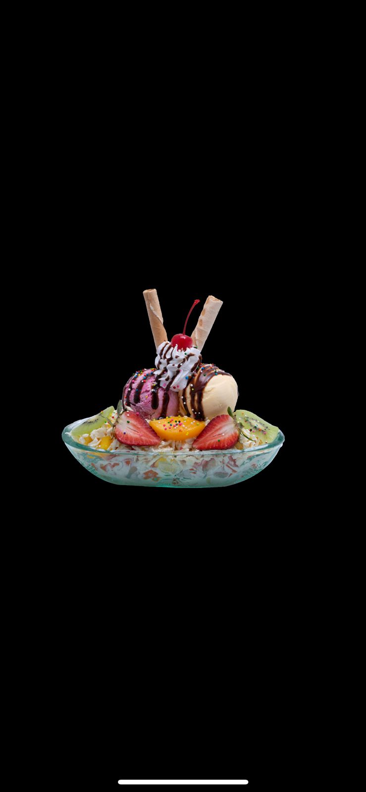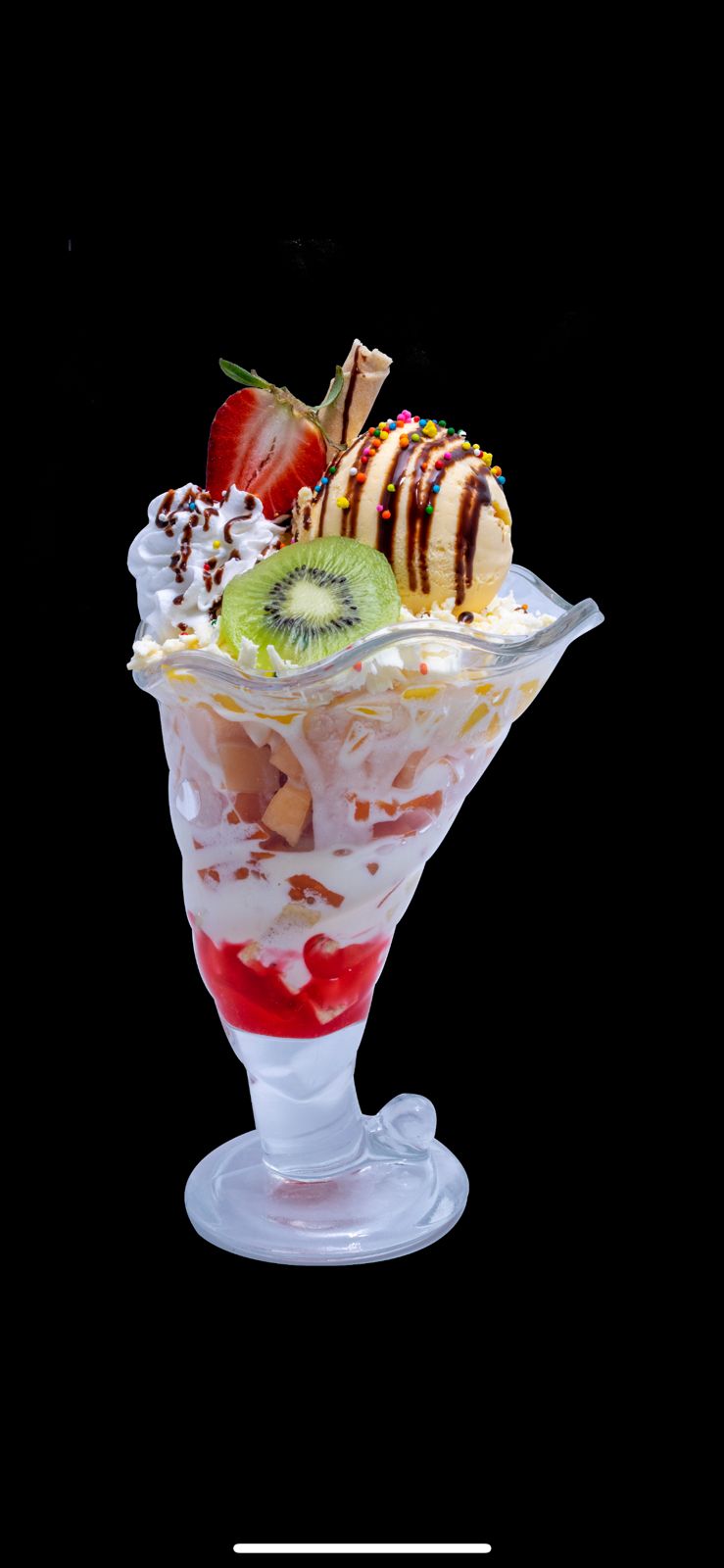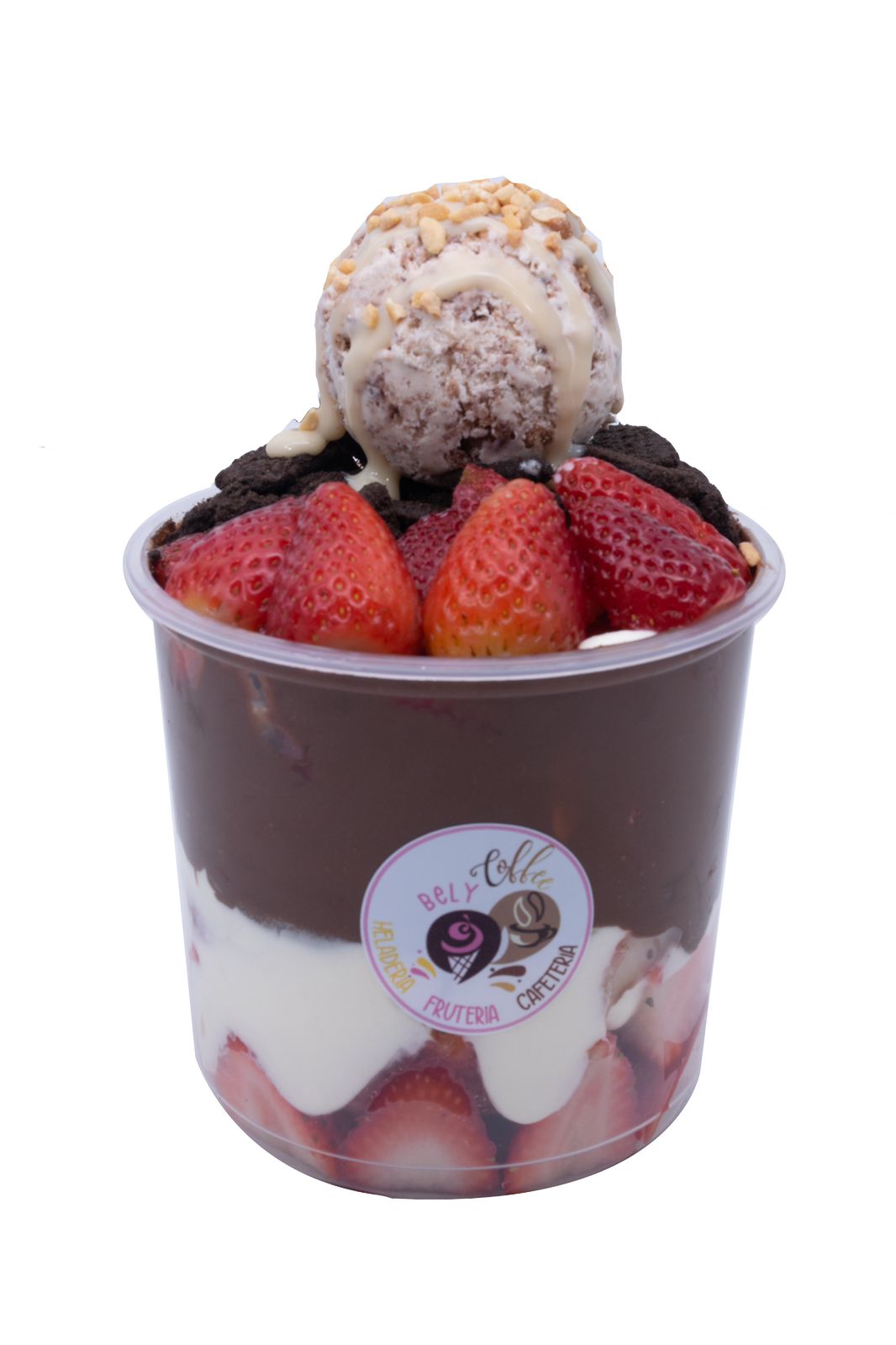 Mix de frutas de temporada, durazno, fresa, chantilly, dos porciones de helado, salsa Hersheys de chocolate, grageas de colores y barquillo.