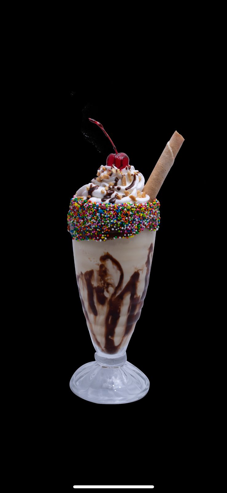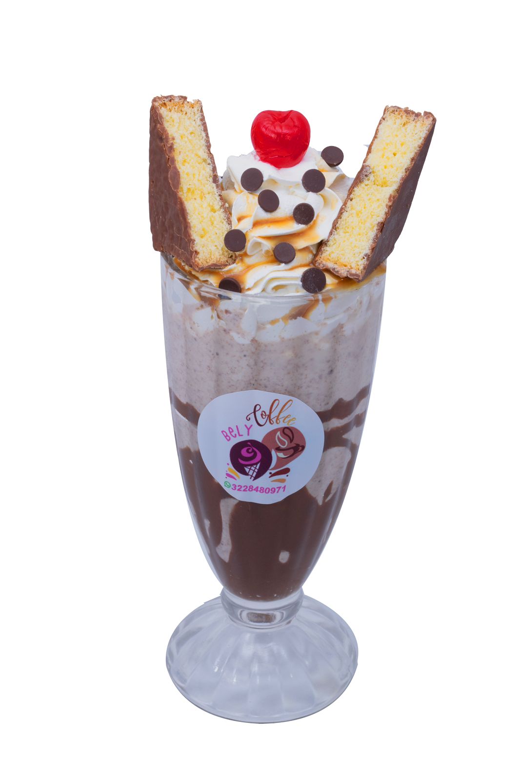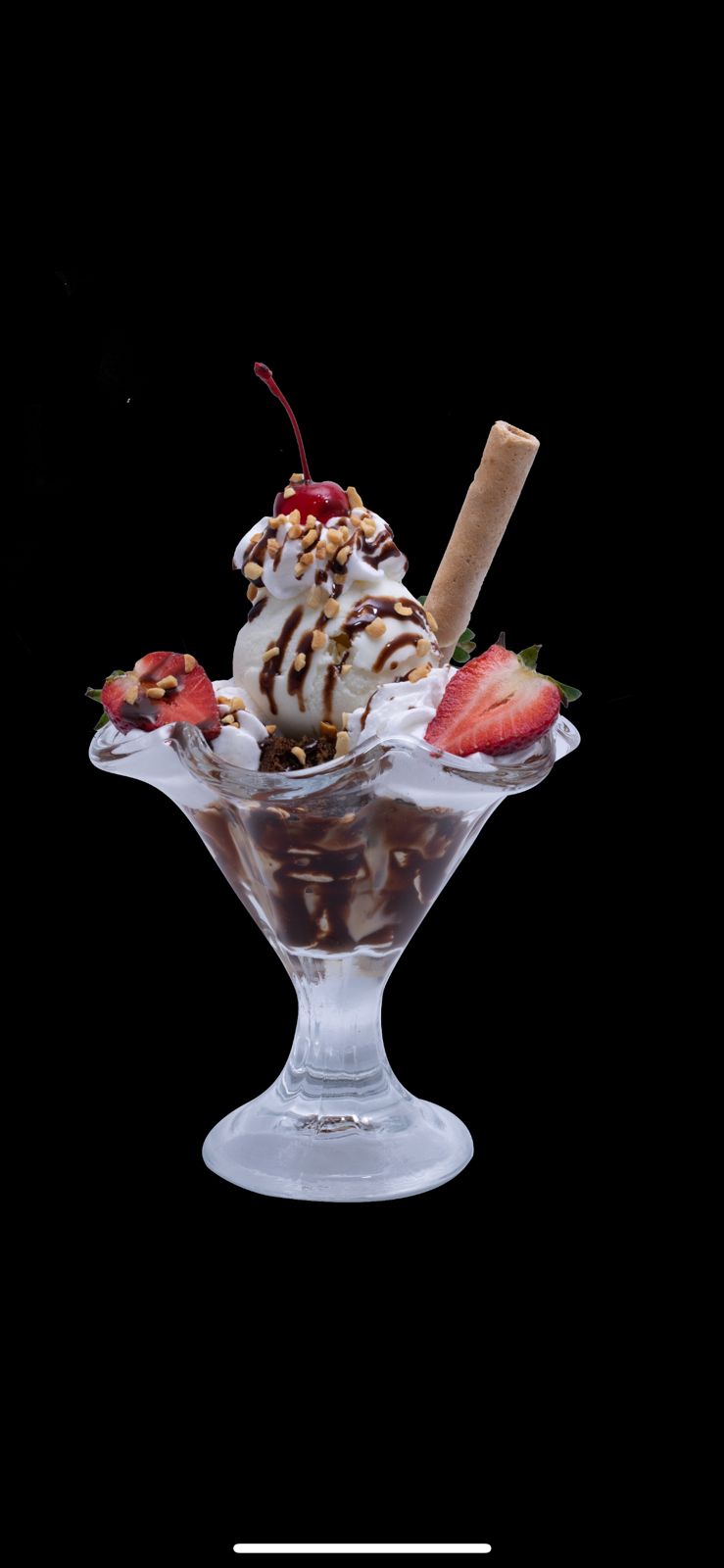 Deliciosa copa con brownie, banano, salsa Hersheys de chocolate, una porción de helado, crema de whisky, decorada con chantilly, fresa, maní, barquillo y cereza.