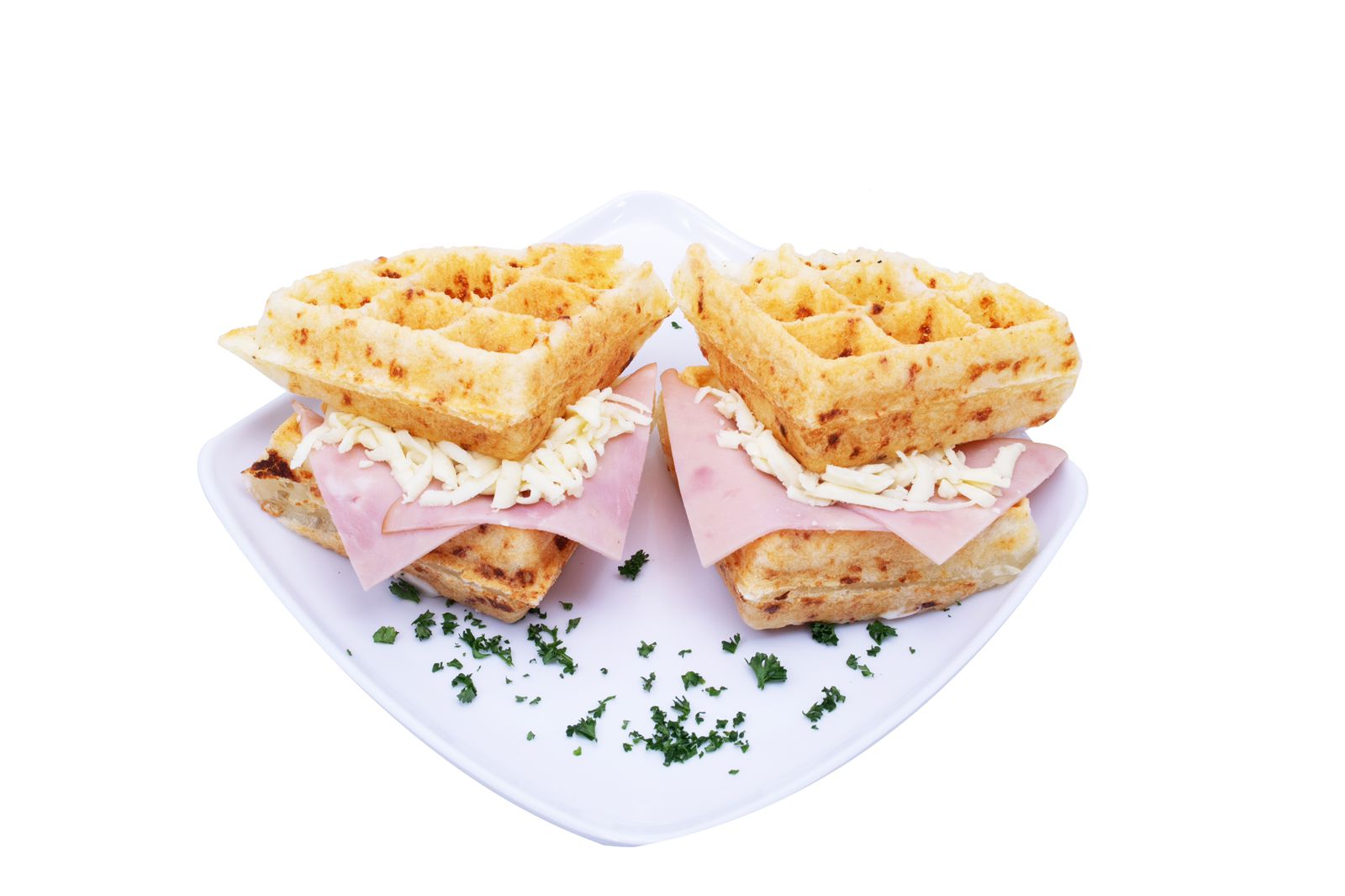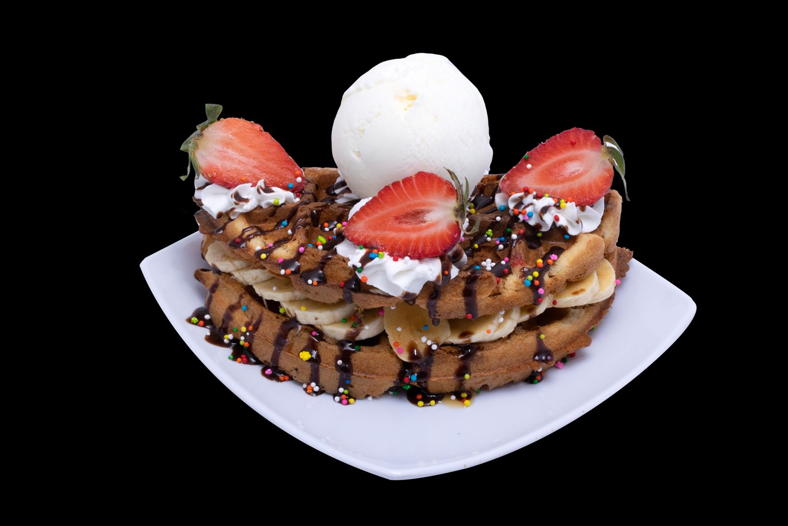 Delicioso waffle con helado, acompañado de banano, salsa de chocolate, fresa, grageas.