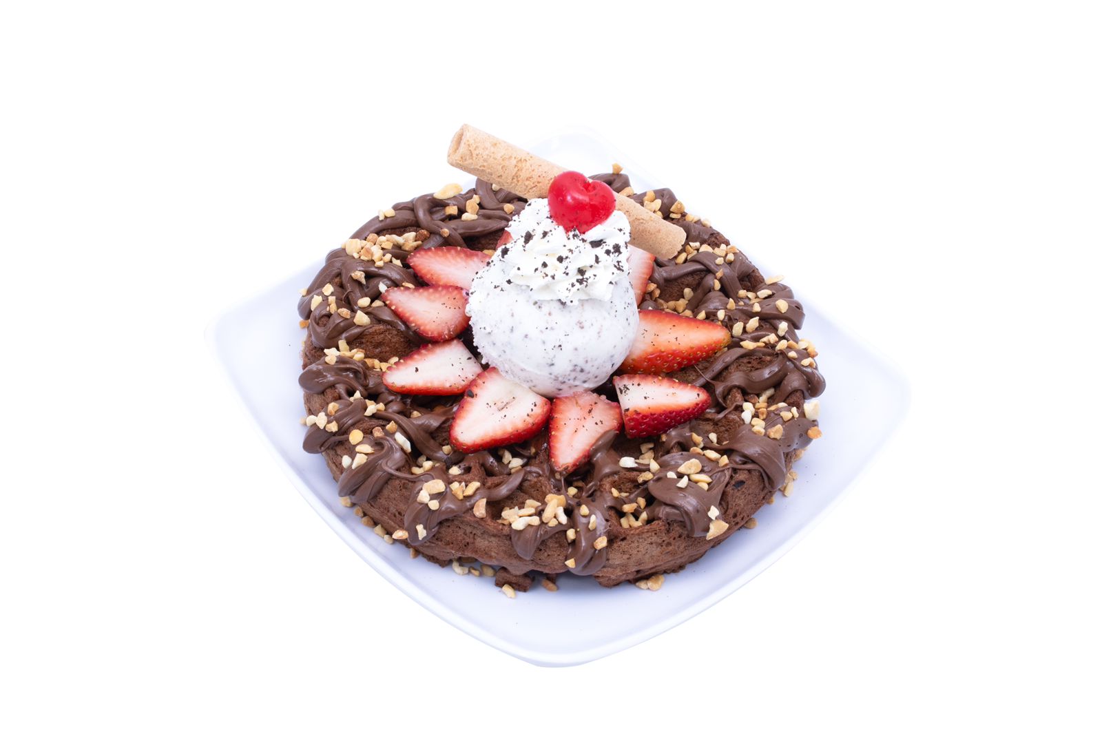 Delicioso waffle con helado, acompañado de banano, Nutella, crema de leche, fresas, durazno, kiwi, chantilly, grageas, cereza y salsa de chocolate.