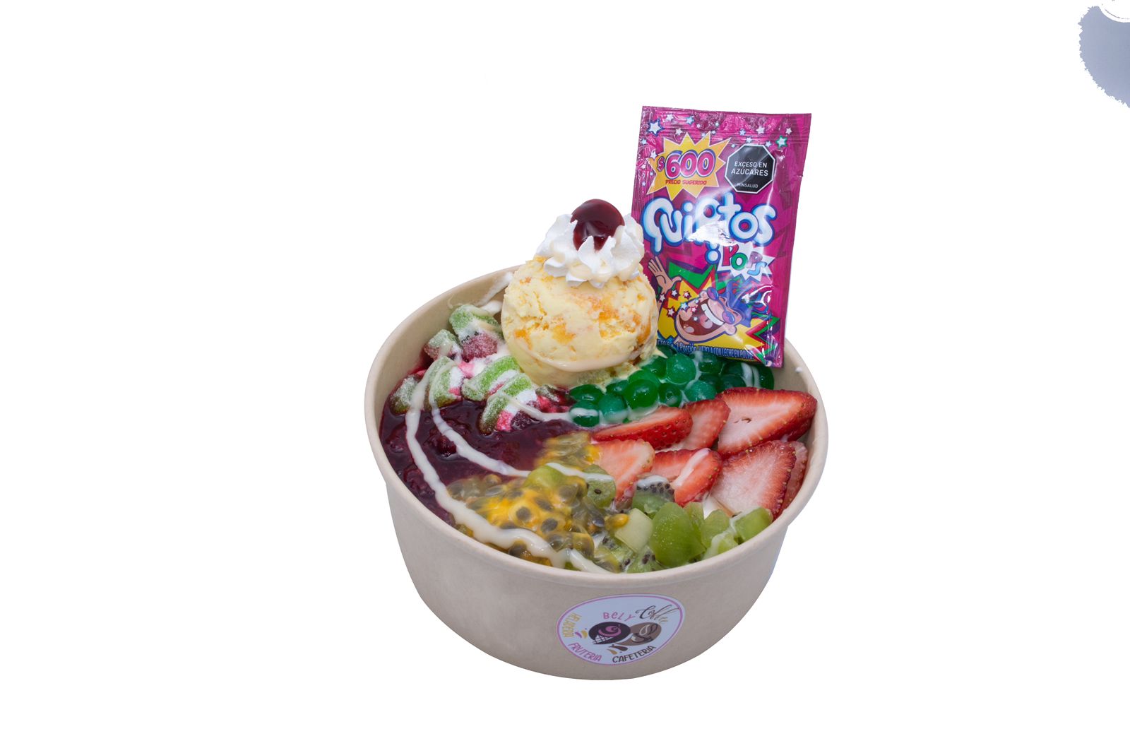 Mix de frutas de temporada, con una porción de helado, crema de leche, queso, decorada con kiwi, fresa, chantilly, grageas de colores y barquillo.