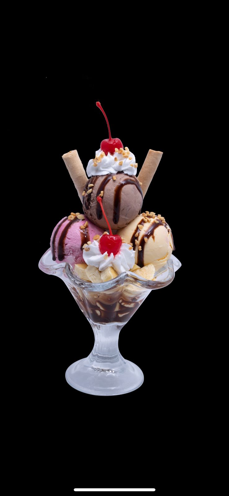 Tres porciones de helado, decorada con salsa de chocolate, banano, chantilly, maní, cereza y barquillo.