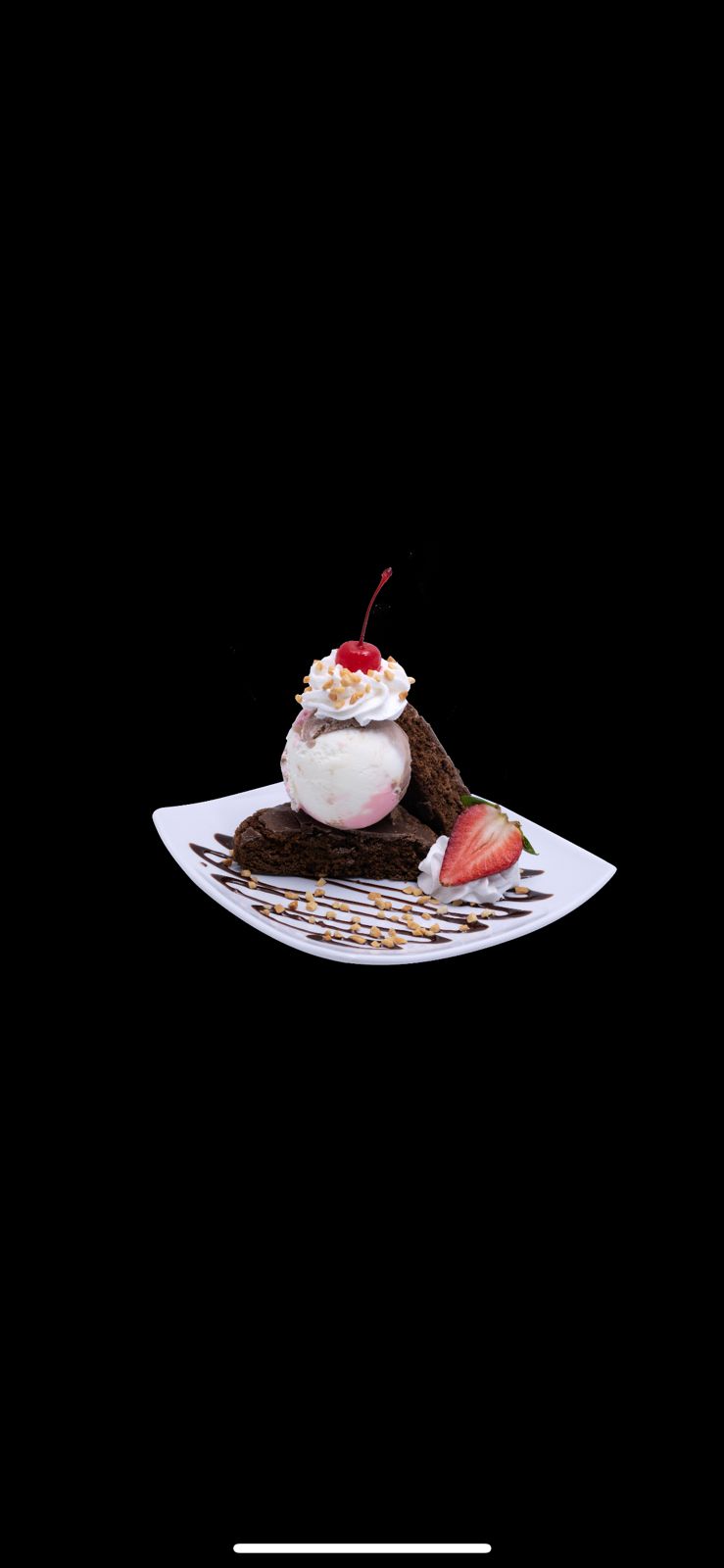Exquisito brownie con una porción de helado, salsa de chocolate Hersheys, maní, chantilly, fresa, y cereza.
