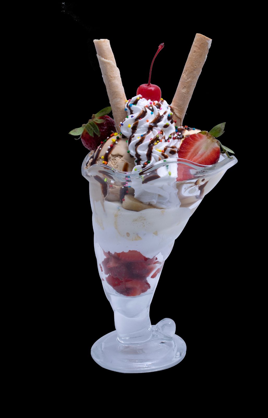 Copa Deseo Fresas Crema de leche Banano en rodajas Chantilly 2 bolas de helado a elección Cereza Barquillos crujientes