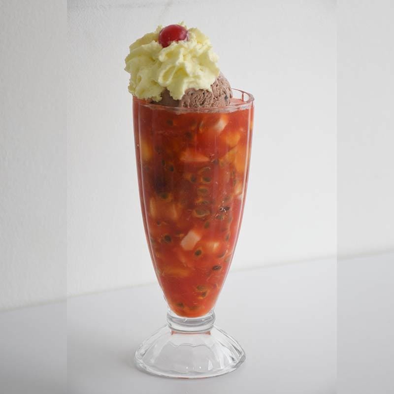 Deliciosa mezcla de fruta picada y crema de leche ( banano, papaya, melón, piña, mango, fresa , manzana ) decorada de queso campesino y coco rayado, fresa , manzana, uva,cereza,helado.