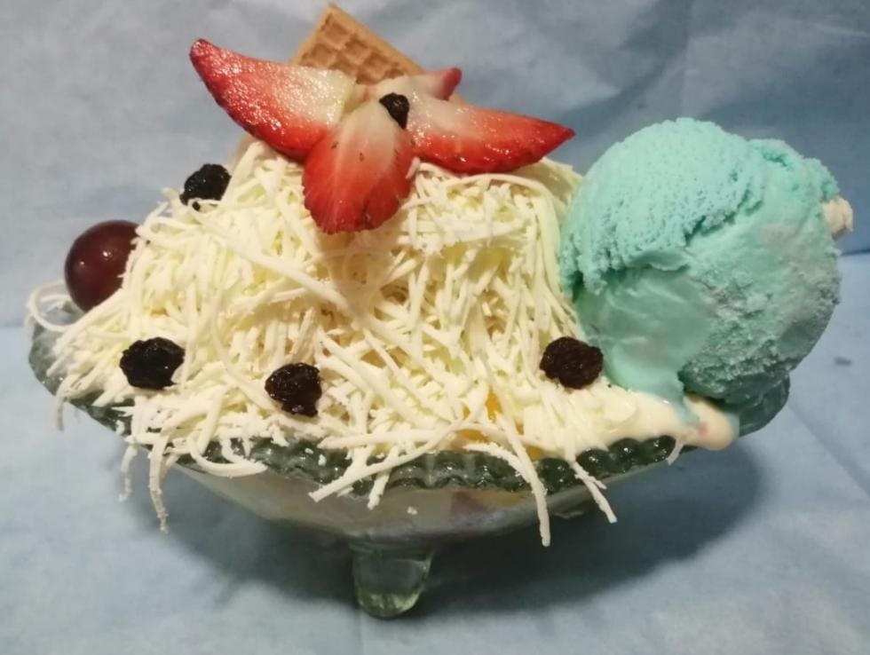 Deliciosa mezcla de fruta picada y crema de leche ( banano, papaya, melón, piña, mango, fresa , manzana ) decorada de queso campesino rayado, freza , manzana, uva,durazno, kiwi,pitaya,higo, cereza,helado.