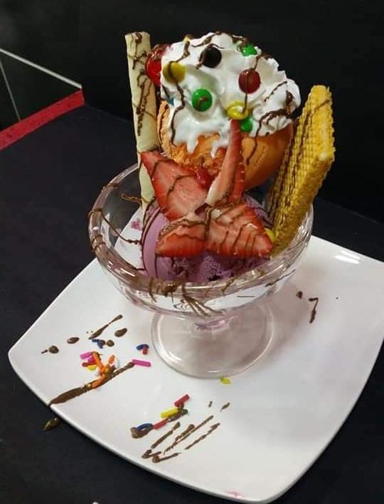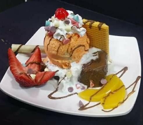 1 delicioso Brownie, 2 porciones de helado decorado con durazno,fresa ,cerezas,kiwi,crema de leche,barquillos y galletas
