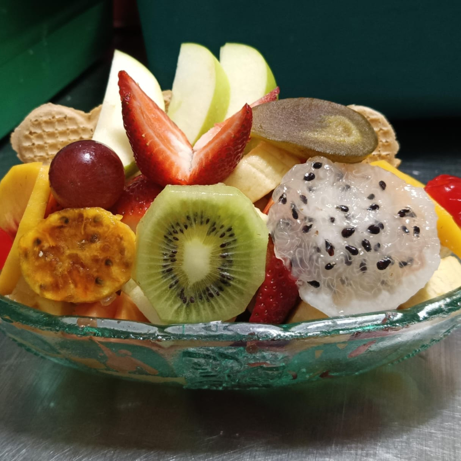 Deliciosa mezcla de fruta picada y crema de leche ( banano, papaya, melón, piña, mango, fresa , manzana ) decorada de queso campesino rayado, fresa , manzana, uva ,durazno,kiwi,pitaya,higo,cereza, 2 helados ,medio platillo .