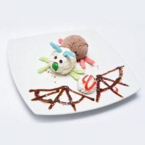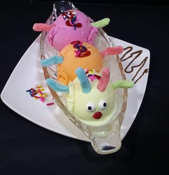 Dos porciones de helado decorado con gomas grizzly , gusanito,salsa de chocolate