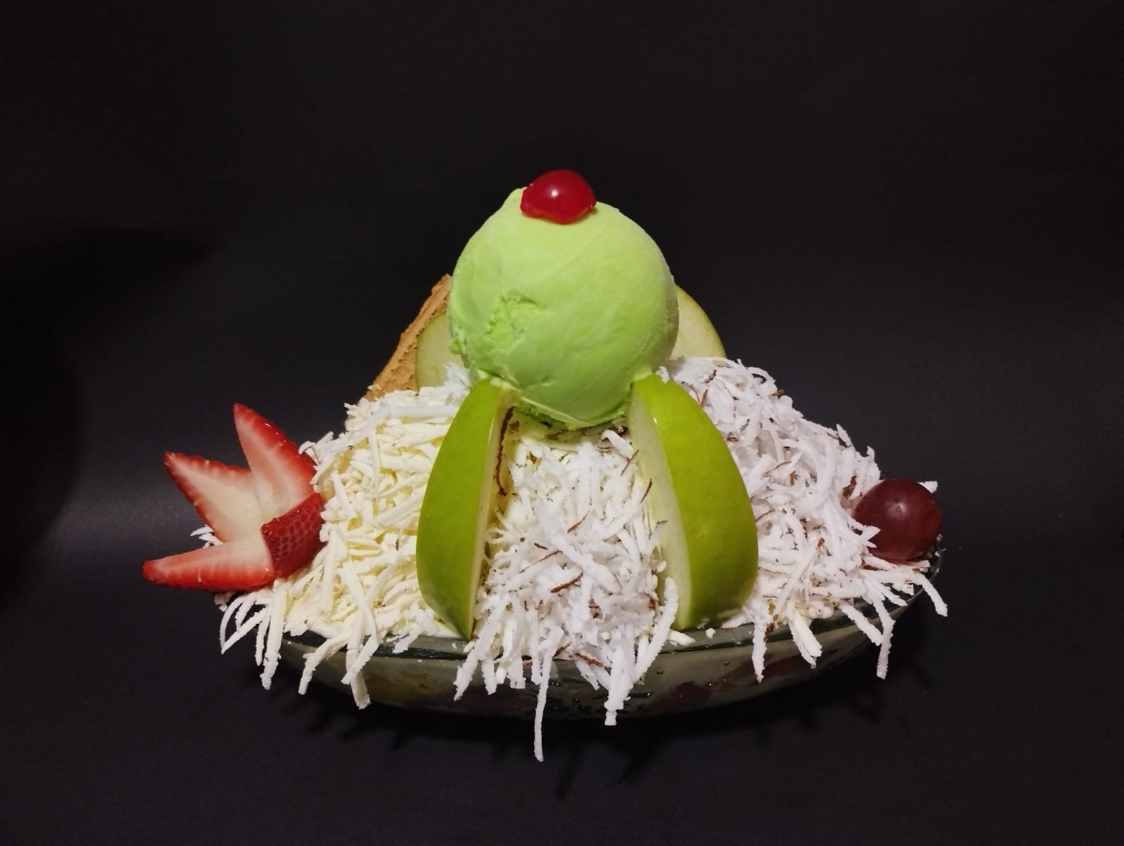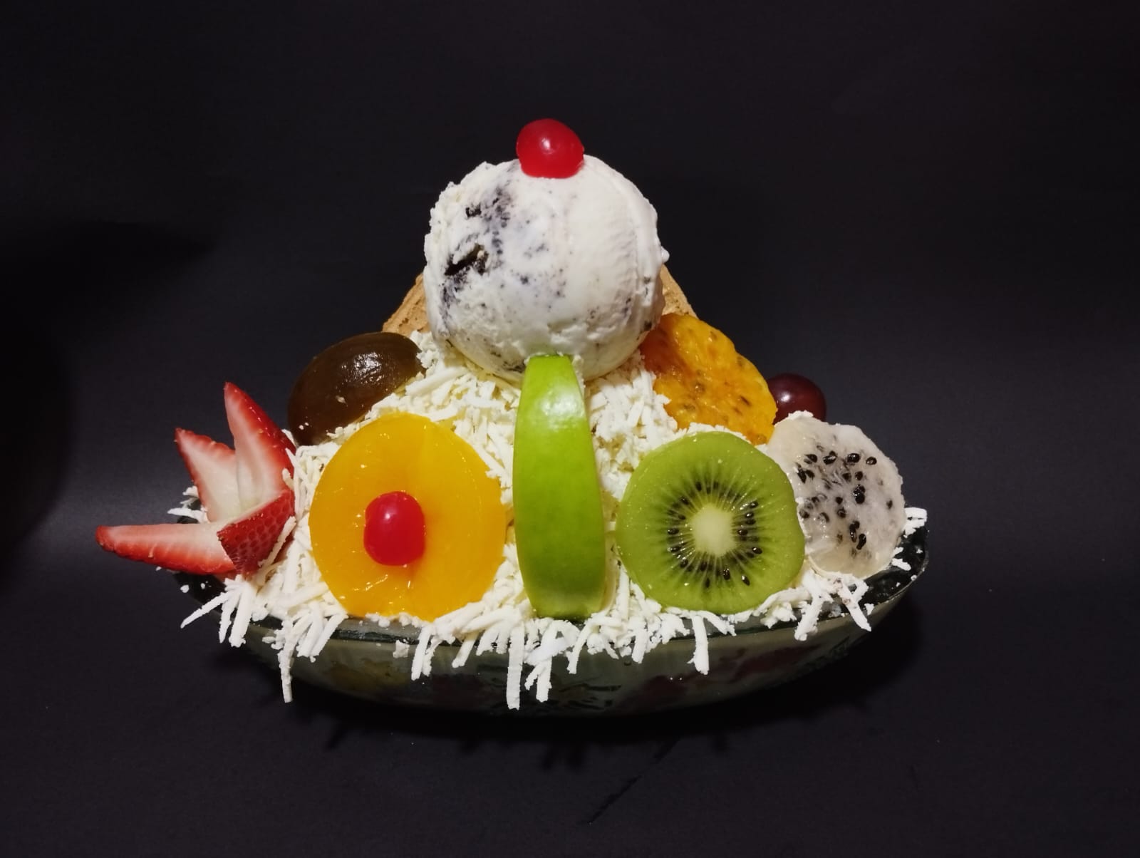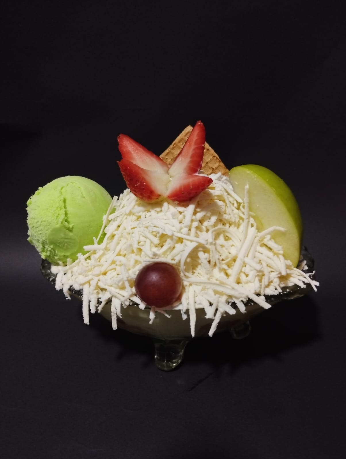 Deliciosa ensalada de frutas de papaya, banano, fresa, mango, piña y manzana. Agregados: queso campesino, coco y deliciosa crema de leche, 1 porción de helado a elegir (fresa, vainilla, mora). Decoración: fresa, manzana, uva, cerezas, miel, salsa de mora y galletas.