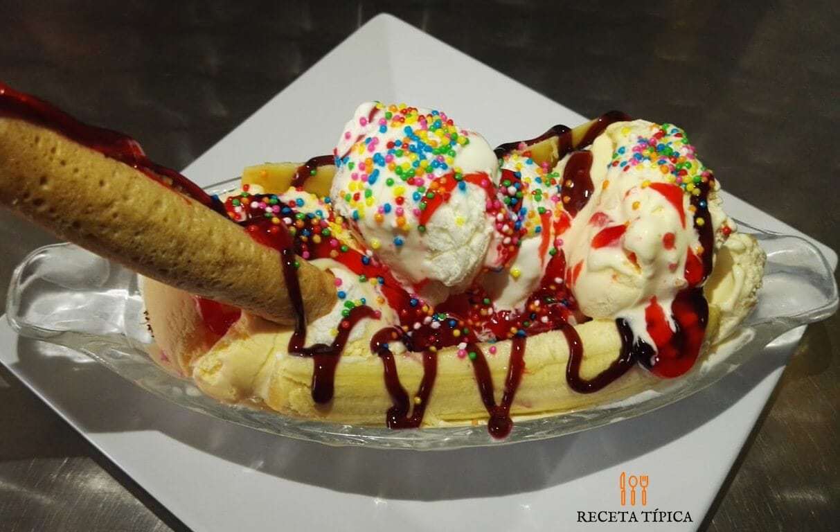 Delicioso picado de banano. Agregados: queso campesino y deliciosa crema de leche, 2 porciones de helados a elegir (fresa, vainilla, mora) y 1/2 platillo de helado. Decoración: durazno, kiwi, cerezas, uva, miel, salsa de mora y galletas.