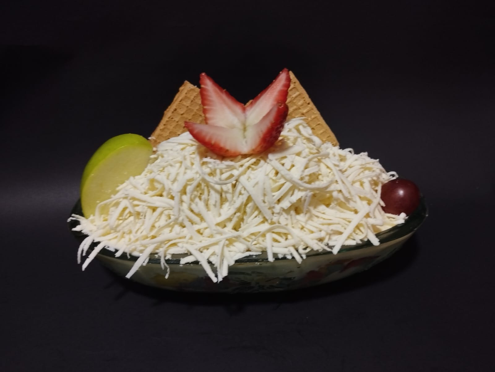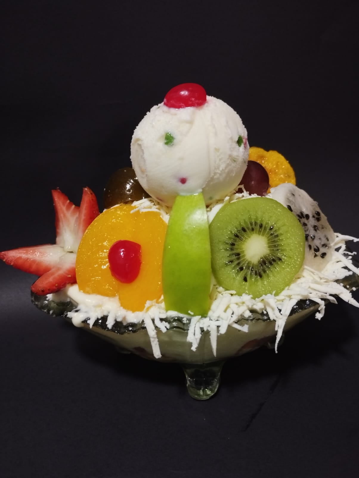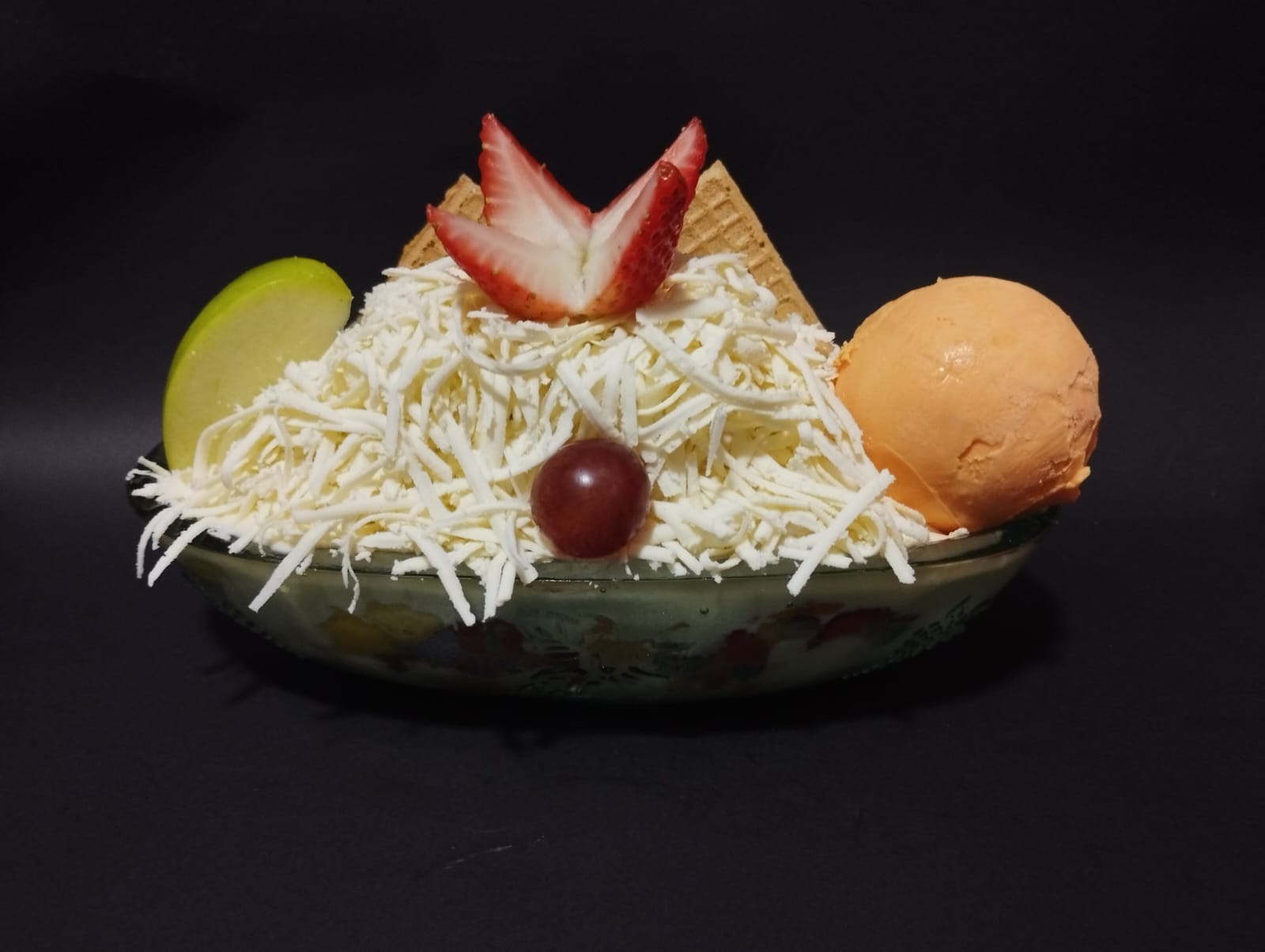 Deliciosa ensalada de frutas de papaya, banano, fresa, mango, piña y manzana. Agregados: queso campesino y deliciosa crema de leche, 1/2 platillo de helado a elegir (fresa, vainilla, mora). Decoración: kiwi, durazno, pitaya, higo, cerezas, uva, miel, salsa de mora y galletas.