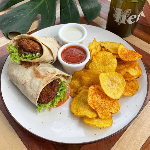 Wrap relleno de falafel, verduras frescas y mayo de albahaca. Acompañado de chips de papa criolla y bebida.