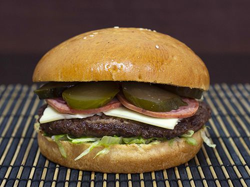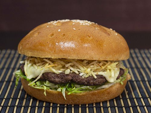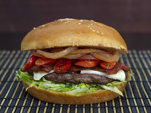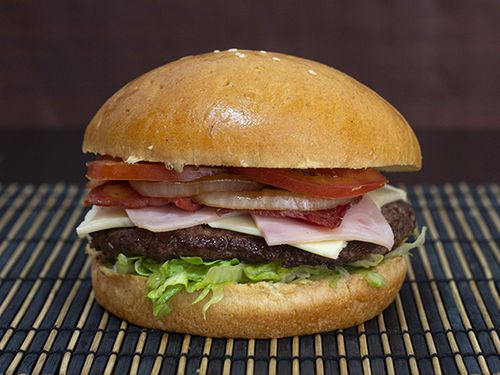 carne artesanal de 150grs, jamon de cerdo, tocineta, queso mozarella, lechuga, tomate, cebolla caramelizada y salsas.