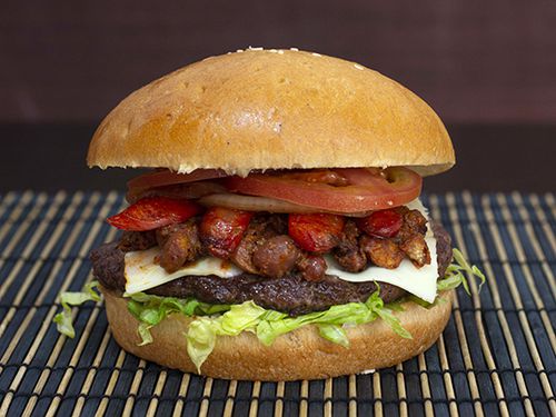 Apetecible carne de hamburguesa, chorizo, chile, queso mozzarella, tomate, lechuga y salsa de ajo.