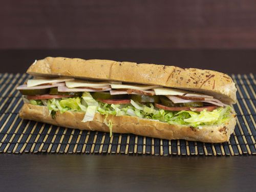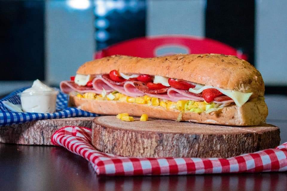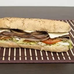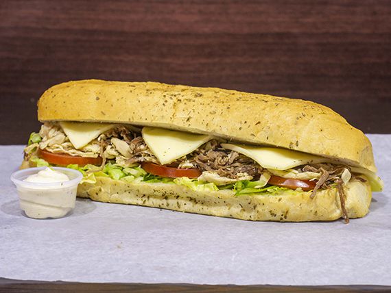 Gustoso jamón de cerdo, pernil ahumado, salami, pepinillos agridulces, queso mozzarella, lechuga y salsa de ajo.