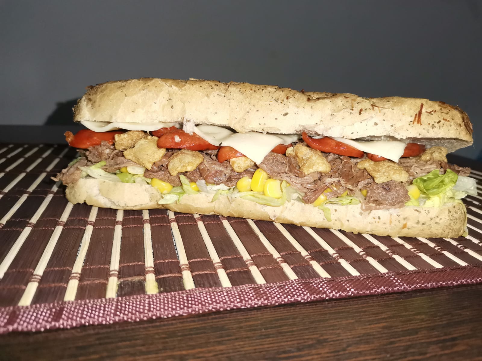 Apetitosa carne de res desmechada, pechuga de pollo, queso mozzarella, lechuga, tomate y salsa de ajo.
