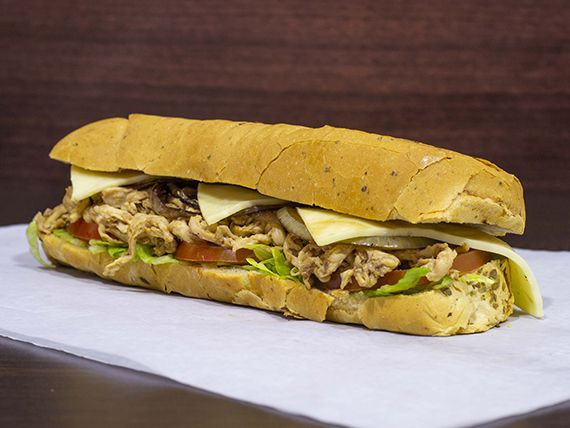 Suculenta pechuga de pollo desmenuzada, salsa teriyaki, queso mozarella, lechuga, cebolla y salsa de ajo.
