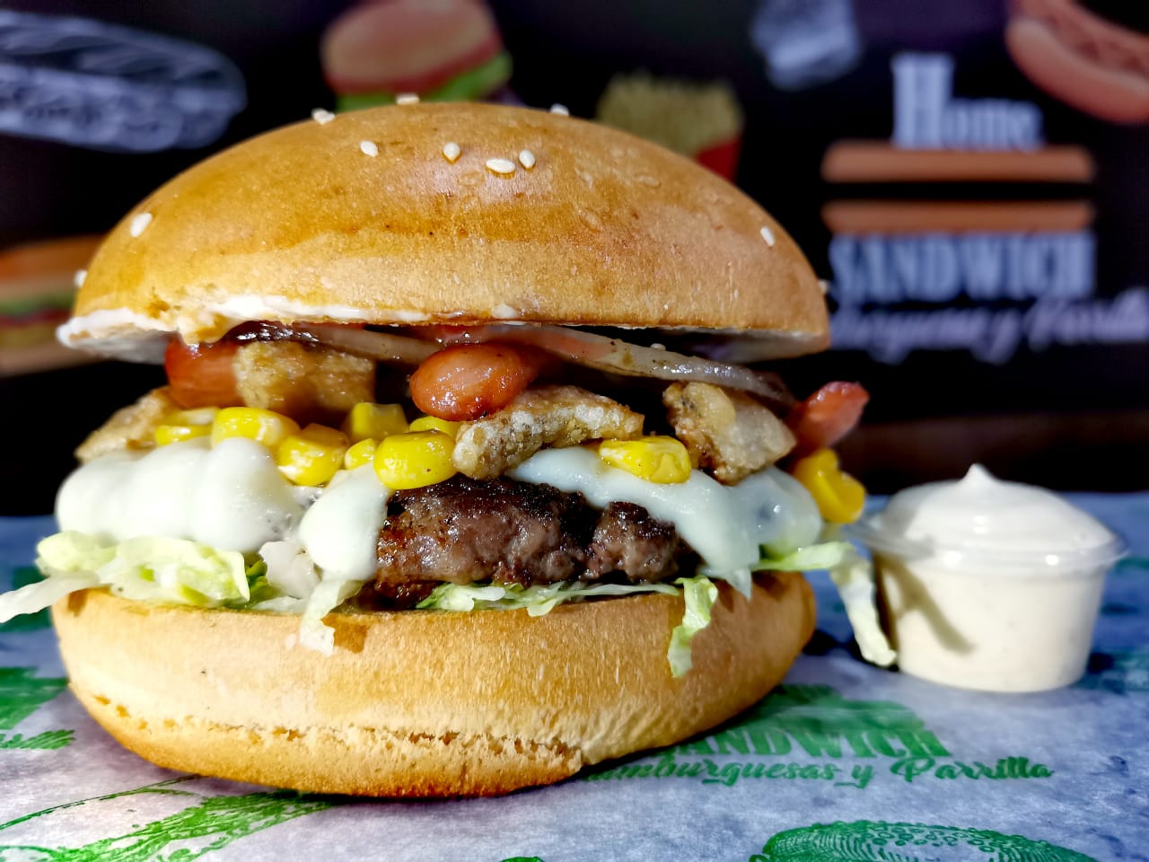 jugosa carne artesanal de 150grs, chicharron crocante, chorizo, maiz tierno, queso mozarella, lechuga y salsas.