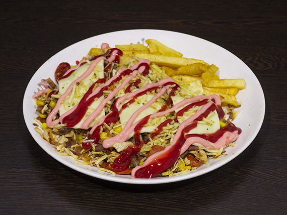Pollo desmenuzado, jamón, chorizo, maíz, queso papa chip y papas a la francesa.