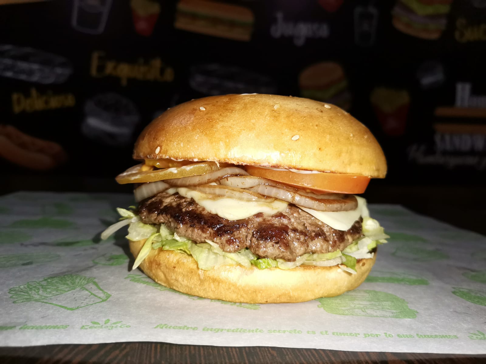 Carne artesanal de 150 grs, queso mozzarella, cebolla grillé, lechuga, tomate, mayonesa y salsa de tomate.