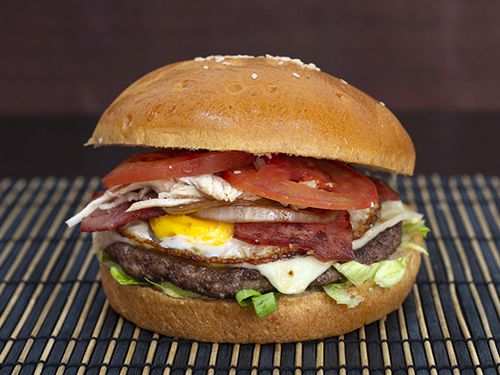 Jugosa carne artesanal, huevo, tocineta, pollo desmenuzado, queso mozzarella, tomate, lechuga, cebolla y salsas.