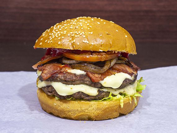 Doble carne artesanal de 150gr, doble queso, tocineta, tomate, cebolla grille, lechuga y salsa de ajo.