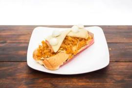 Perro Costeño,Salchicha Americana, butifarra, queso costeño, papa chip, salsa de tomate, mayonesa, cebolla, jamon, suero costeño, huevo frito