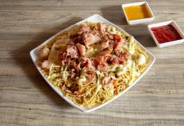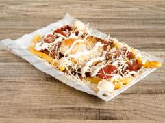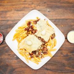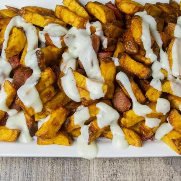 Papa francesa, papa chip, picado de carnes ,chorizo, butifarra, queso costeño, suero costeño, huevo frito,salsa rosada, tartara.