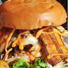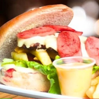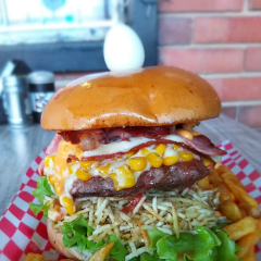 Hamburguesa Hijueburguer-Doble carne pura res, Doble Queso, Maíz, tocineta, platano frito, papa chip, huevo frito, queso cheddar, pan, lechuga, tomate, cebolla, salsa de la casa
