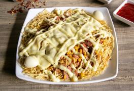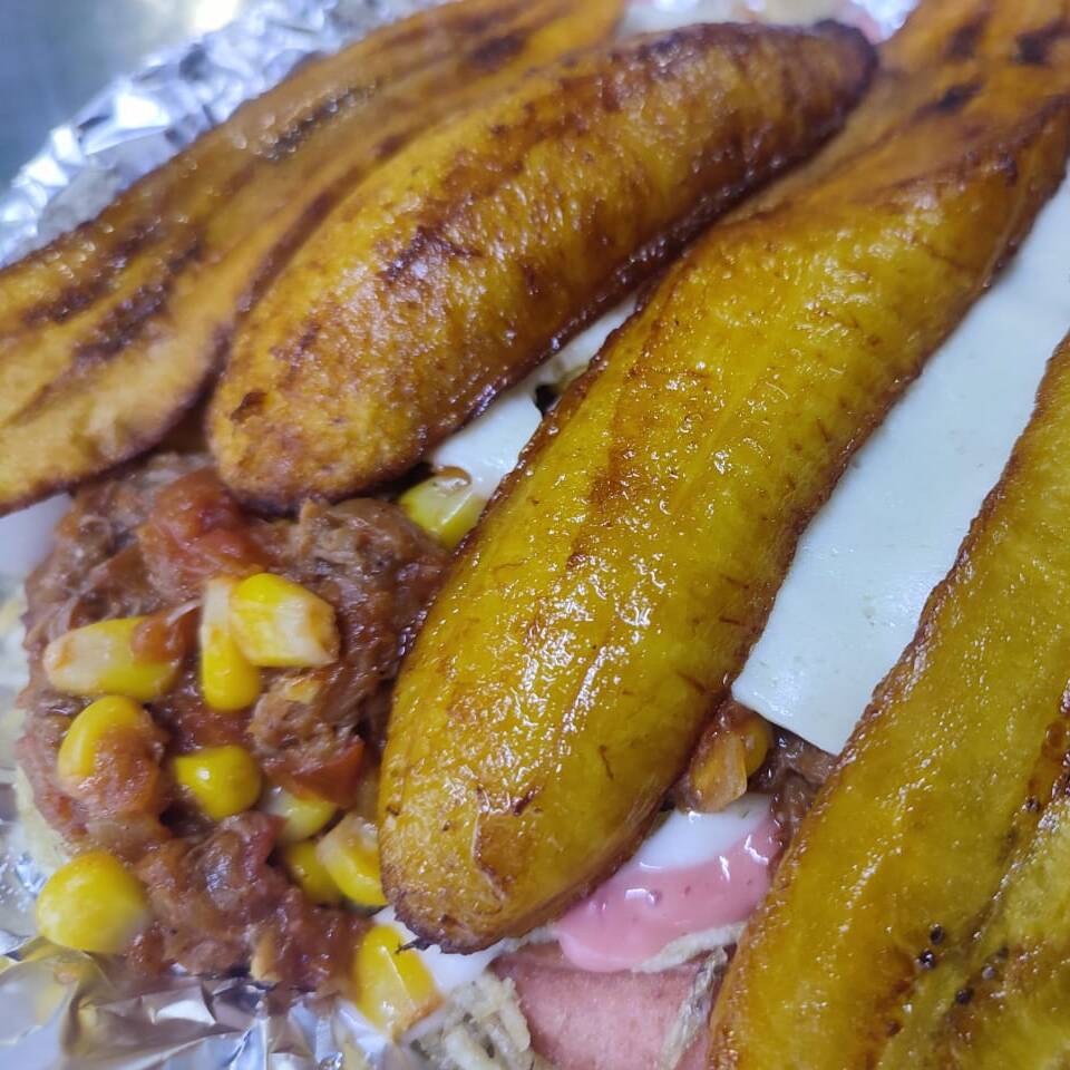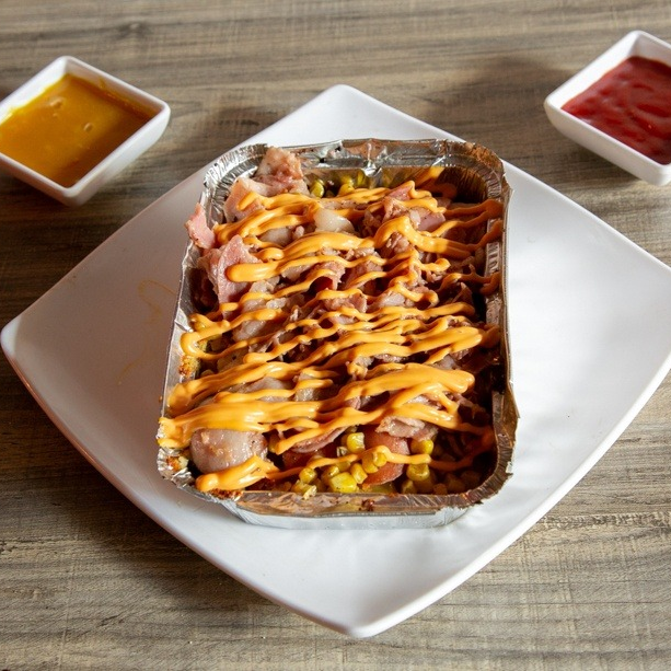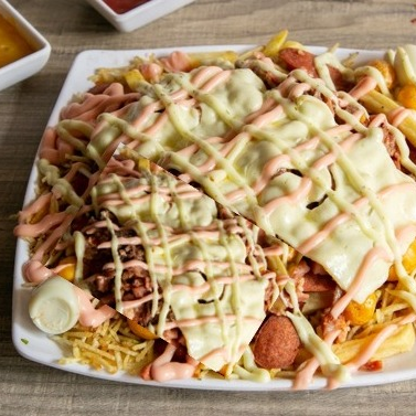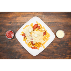 Papa francesa, carne desmechada, maíz, hogao, queso, huevo de codorniz, platano frito, salsa rosada, tartara, salchicha long