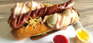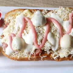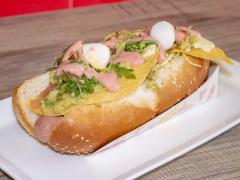 Chori Perro-Chorizo de cerdo, papa chip, cebolla, salsa rosada, tartara, queso, jamon huevo de codorniz