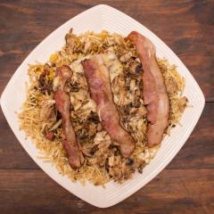 Costillas en salsa bbq, Pechuga, Chorizo, Croqueta de yuca, Papa Criolla.
