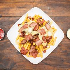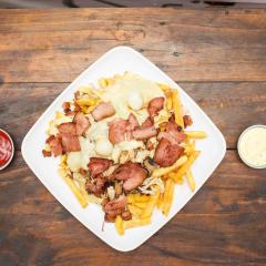 Papa francesa, salsa de queso cheddar, tocineta