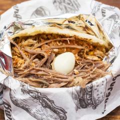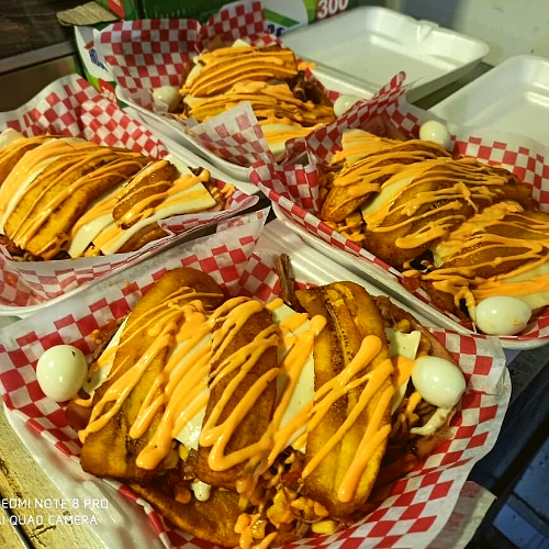 Patacón, Carne, Maíz, Hogao, Salsa De Queso Cheddar, Huevos de codorniz, queso.