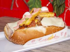 Perro Hawaiano,Salchicha Americana, papa chip, Piña en trozos, Salsa de Piña, cebolla, tartara, salsa rosada, queso, jamon, huevo de codorniz