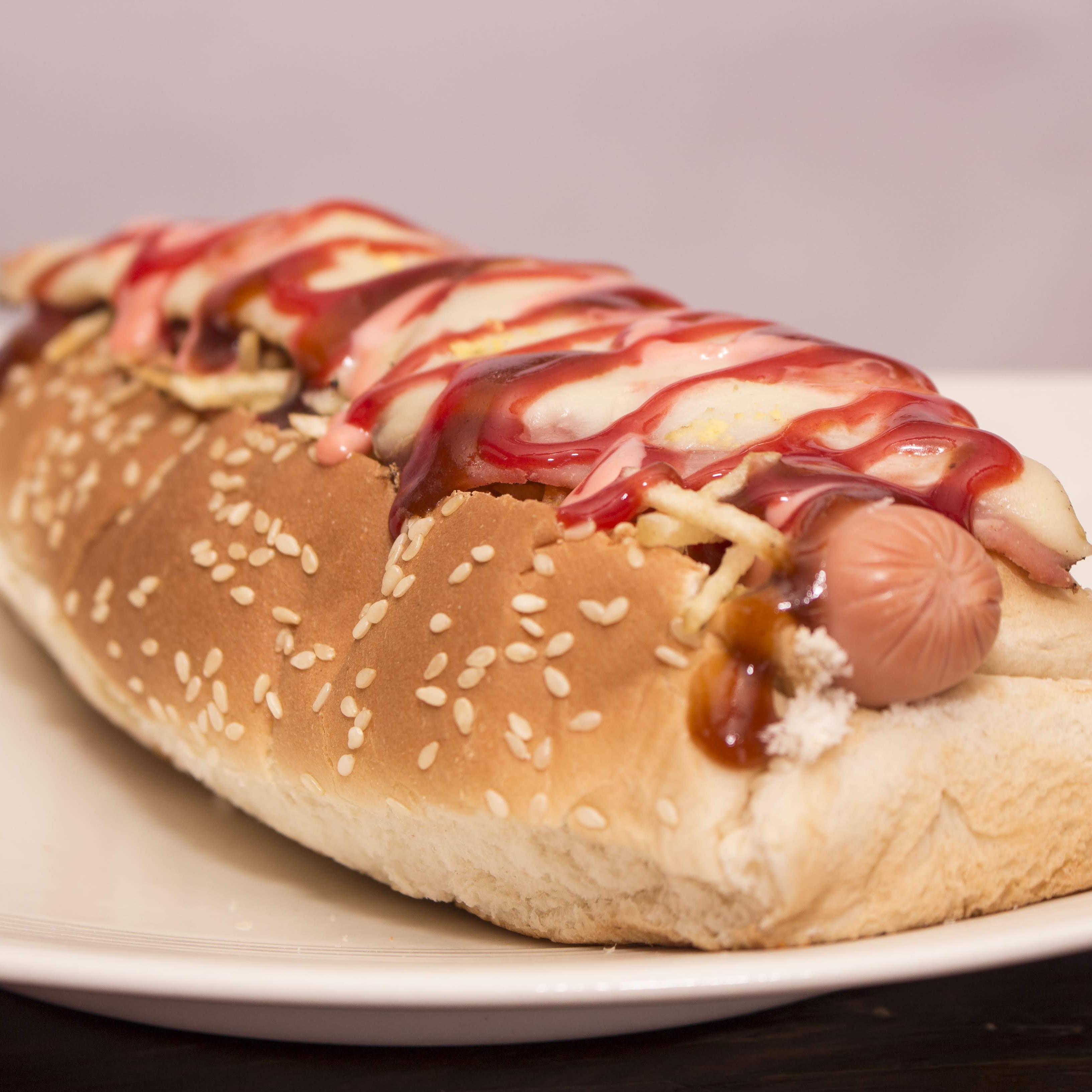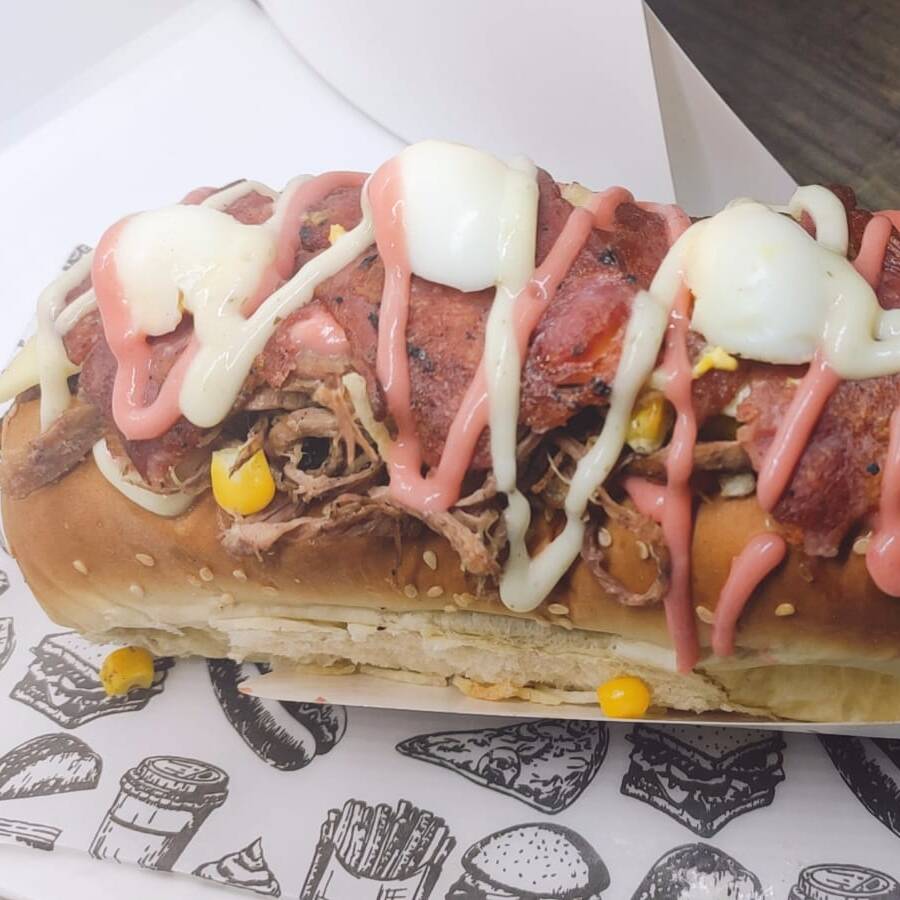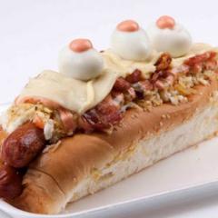 Perro Supremo,Pollo, champiñon, tocineta, Salchicha Americana, papa chip, cebolla, tartara, salsa rosada, queso, jamon, huevo de codorniz