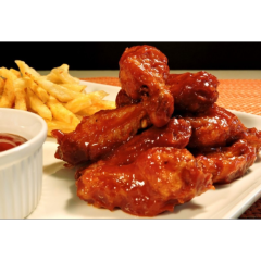 Alitas Bañadas en Salsa Bbq o Miel Mostaza, acompañadas con papa a la francesa.