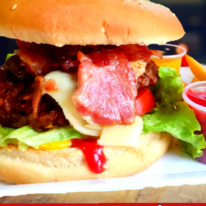 Hamburguesa Bacon ,carne pura res, Queso, tocineta, Maíz, pan,huevo de codorniz, papa chip, lechuga, tomate, cebolla, salsa de la casa