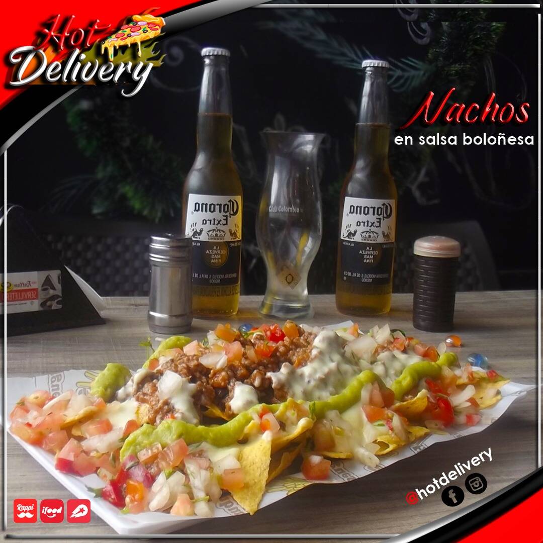 Nachos, carne boloñesa, pico de gallo, queso, guacamole.