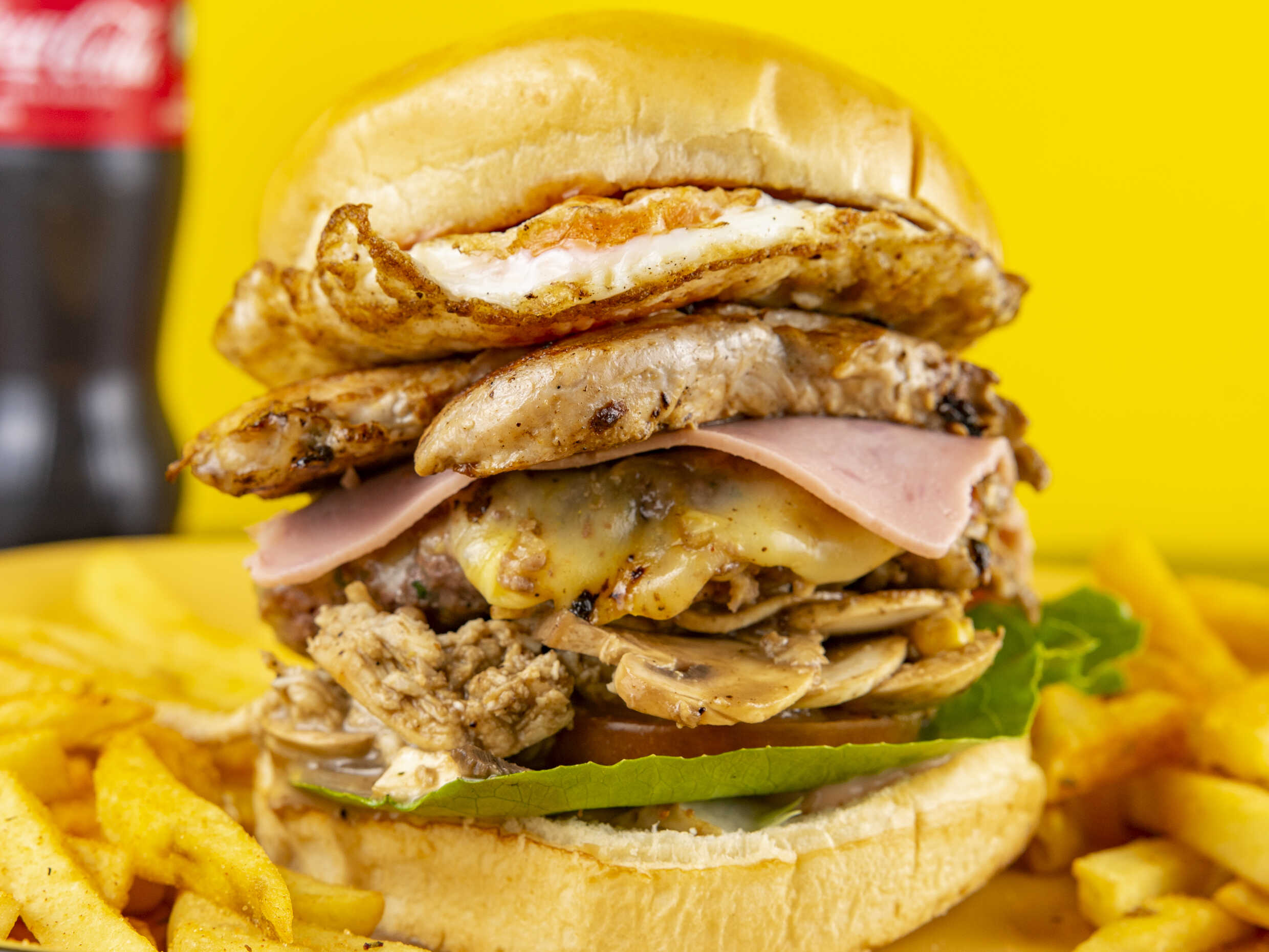 Carne de res, pechuga, pollo desmechado, champiñones, tocineta, queso, huevo frito, papa fosforito, vegetales (lechuga y tomate) y salsas de la casa.