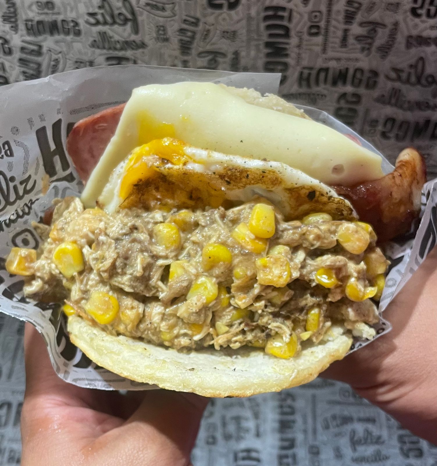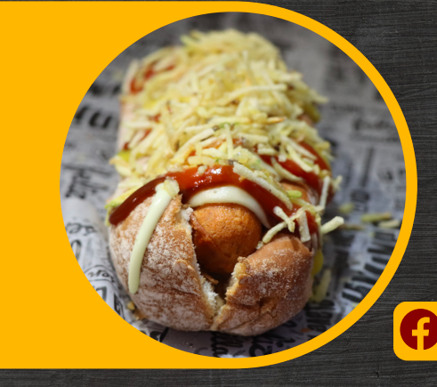 Pan artesanal, Salchicha, queso, papa fosforito y salsas de la casa.