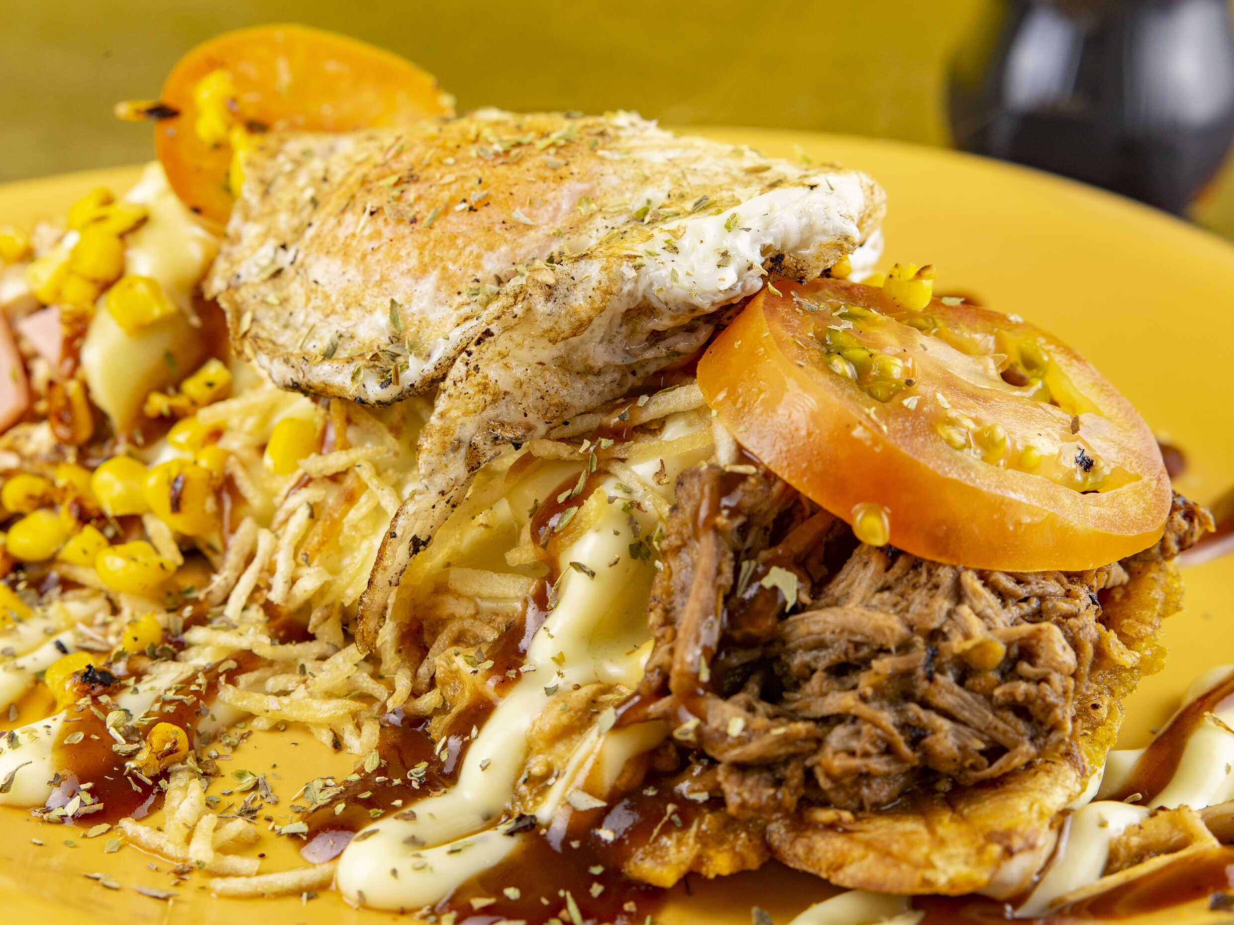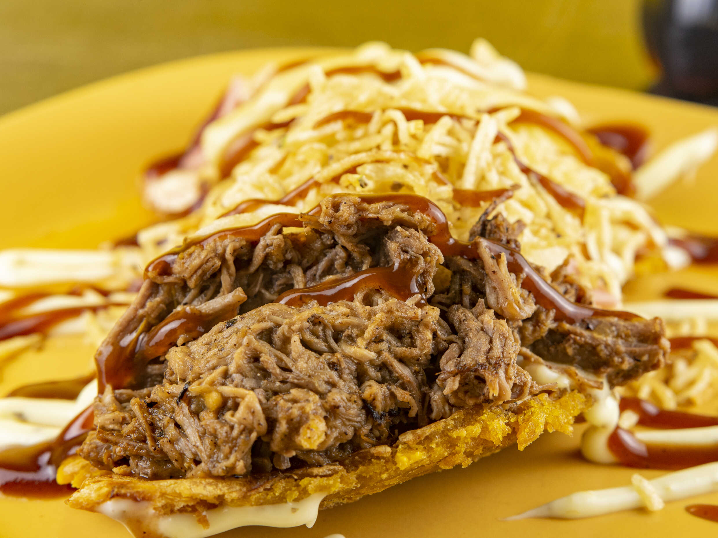Delicioso patacón de carne desmechada, hogao al estilo humes, queso fundido, jamón y salsa BBQ.