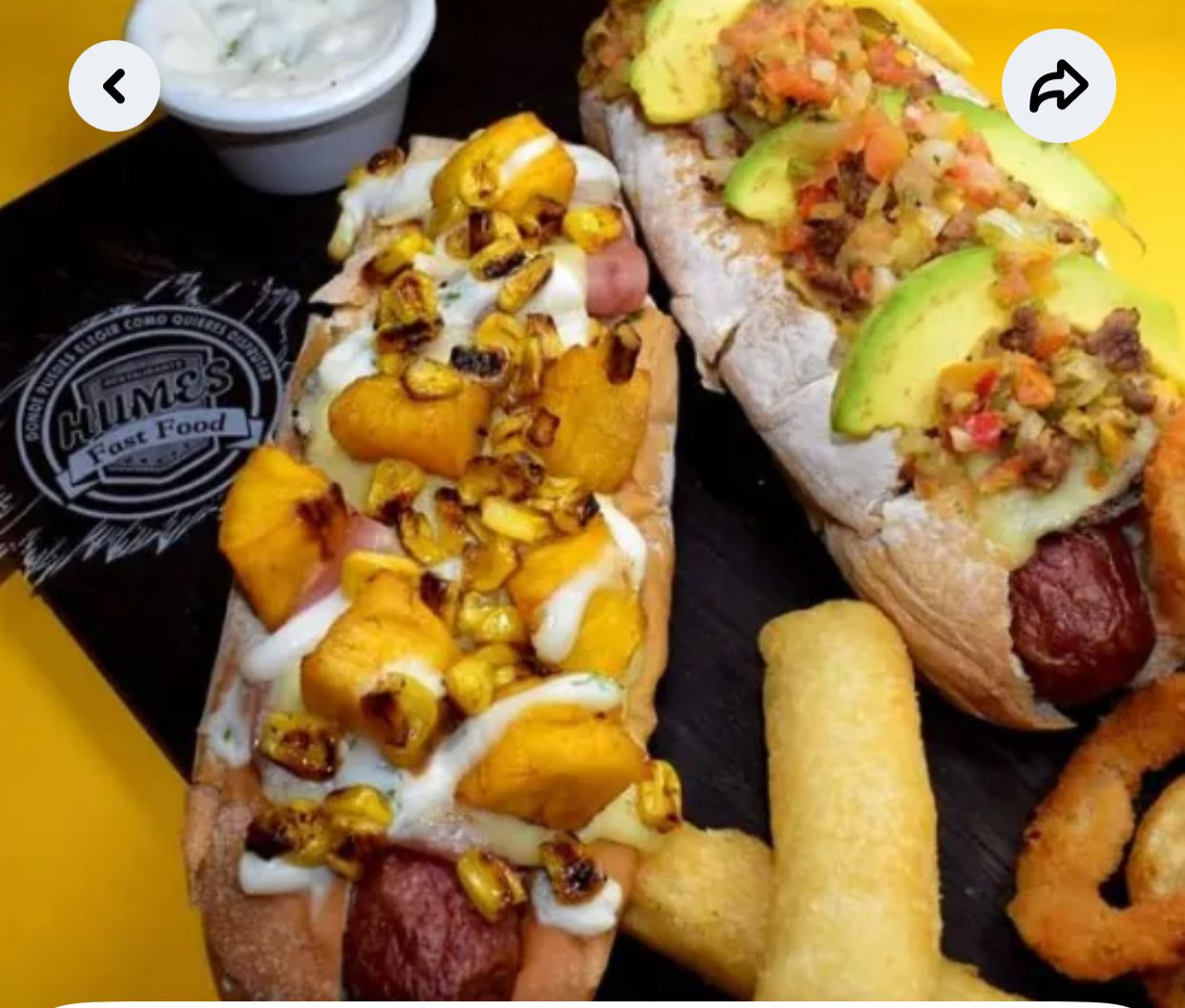 Salchicha americana, pico de gallo, carne desmechada, queso fundido, tocineta, papa fosforito y salsas de la casa.