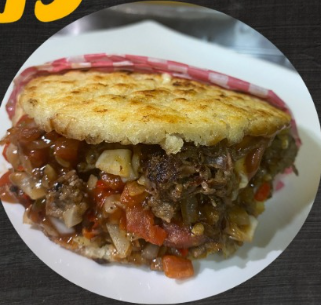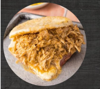 Arepa de maiz con carne desmechada, jamon, queso y salsa criolla.